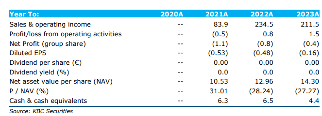 Volgens KBC Securities-analist Sharad Kumar zou het belang in GFI de portefeuille van Whitestone (tot op zekere hoogte) moeten beschermen tegen de algemene marktvolatiliteit. Zijn ‘Som der delen’-model geeft beoogde vermogenswaarde (TEV) aan van 15,2 euro per aandeel. Na toepassing van een illiquiditeitskorting van 10,0% op groepsniveau start hij de opvolging van het aandeel met een ‘Kopen’-aanbeveling en een koersdoel van 13,7 euro.