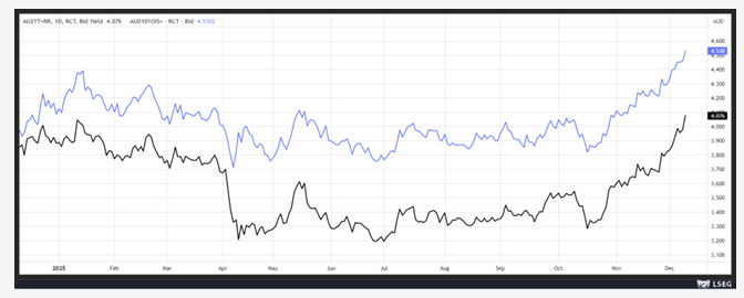 Deze opmerkingen deden de Australische obligatierentes op 2 en 10 jaar stijgen. Gezien het niveau van de 2-jaars rente rekent de markt op het equivalent van twee renteverhogingen volgend jaar.