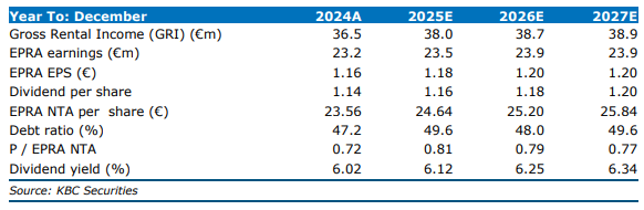 Het property operating result* kwam uit op 20,9 miljoen euro, tegenover 19,8 miljoen euro verwacht. De schuldgraad steeg licht naar 49,9%, tegenover 48,0% een jaar eerder. De gemiddelde kost van schulden bedraagt 2,15%, met een looptijd van 3,5 jaar. 77,8% van de schulden is afgedekt, met een gemiddelde looptijd van de hedges van 4,9 jaar. De guidance voor 2025 werd bevestigd: EPRA-winst per aandeel van 1,20 euro en een dividendverhoging boven de langetermijninflatie (1,14 euro over 2024).