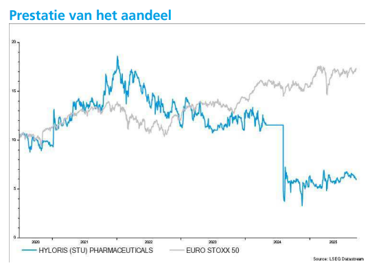 Hyloris rapporteerde een lagere omzet in de eerste jaarhelft van 2025, voornamelijk door het uitblijven van mijlpaalbetalingen voor Combigesic IV in de VS. Toch blijft het bedrijf vooruitgang boeken in zijn pijplijn, ondanks enkele verschuivingen in de timing van klinische studies. Hyloris bevestigt zijn ambitie om tegen eind 2025 dertig producten in portefeuille te hebben, aldus KBC Securities-analist Jacob Mekhael.
