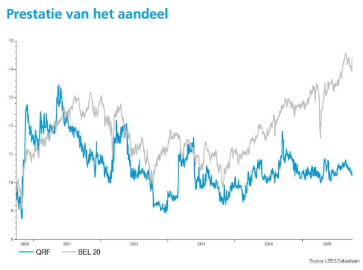 QRF lanceert de kapitaalverhoging van ongeveer 25 miljoen euro aan een inschrijvingsprijs van 9,62 euro per aandeel. Die prijs is berekend op basis van de slotkoers van maandag (10,25 euro), verminderd met het pro rata dividend van 0,63 euro* (uit een totaal dividend van 0,84 euro voor 2025). Er is dus geen korting ten opzichte van de slotkoers.