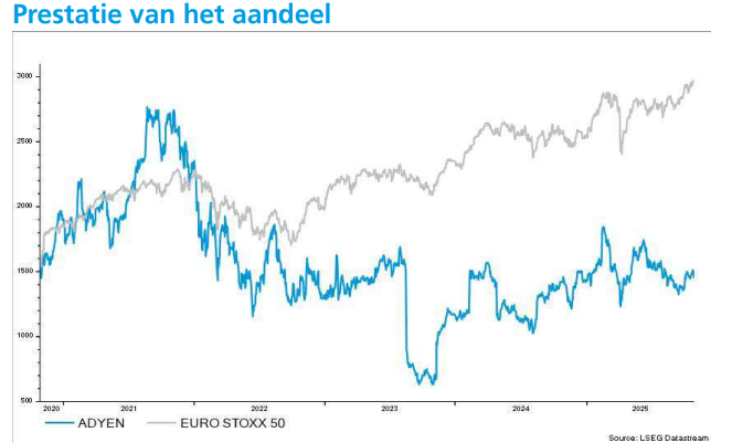 Adyen publiceerde vandaag een beknopte bedrijfsupdate zonder winstcijfers. Volgens KBC Securities-analist Thomas Couvreur werd de omzetverwachting licht overtroffen, ondanks dat de verwerkte volumes opnieuw werden vertekend door Cash App*. De aangepaste vooruitzichten voor 2025 impliceren ook een lichte meevaller ten opzichte van de gemiddelde analistenverwachting (gav) voor de tweede jaarhelft.