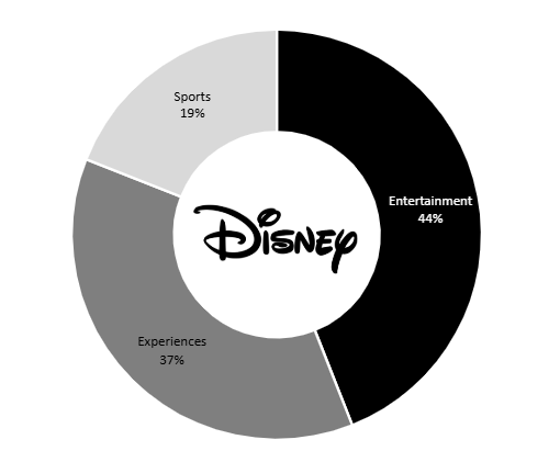 De inkomsten van Disney zijn gediversifieerd over drie belangrijke segmenten. Entertainment is het grootste, goed voor 44% van de totale inkomsten, aangedreven door filmstudio's, televisienetwerken en streamingdiensten. Experiences, met inbegrip van themaparken, resorts en cruises, zijn goed voor 37%. Sports, voornamelijk ESPN, vertegenwoordigt 19% van de inkomsten. Deze gediversifieerde mix zorgt voor segmentoverschrijdende synergiën.