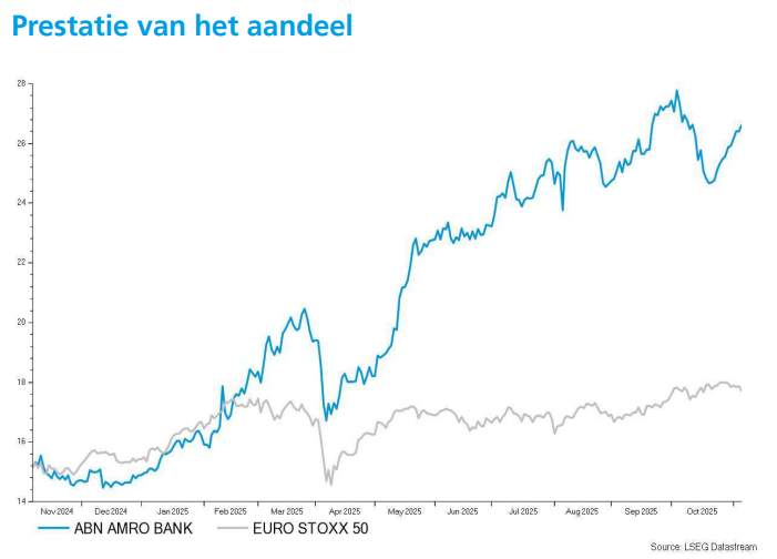KBC Securities-analist Thomas Couvreur merkt op dat ABN Amro een indrukwekkende koersstijging heeft doorgemaakt, maar dat de huidige waardering al veel toekomstverwachtingen weerspiegelt. De verwachtingen voor de Capital Markets Day op 25 november zijn bijzonder hoog, waardoor het moeilijk wordt om positief te verrassen.