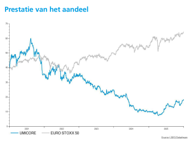 De metaalprijzen zijn bijzonder gunstig geweest: de goudprijs steeg met circa 65% sinds begin 2025, zilver met 148%, rhodium met 109%, platina met 132% en palladium met 79%. Eind eerste helft van 2025 had Umicore al een deel van de blootstelling aan deze metalen gehedged* voor de komende jaren, met afdekkingen tussen 50% en 80% voor 2026-2027 en ongeveer 50% voor 2028.