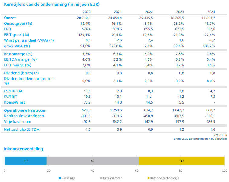 Umicores doelstellingen volgens de Capital Markets Day mikken op 1,1 miljard euro omzet tegen 2028, met een aangepaste EBITDA van 275 tot 325 miljoen euro (tegenover de verwachting van break-even in 2025). Het bedrijf beschikt over take-or-pay-contracten* (onder andere met Volkswagen via Ionway, ACC en SK On) die oplopen tot circa 133 GWh tegen 2028.