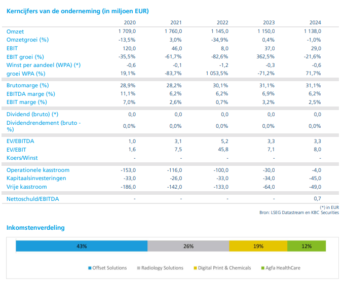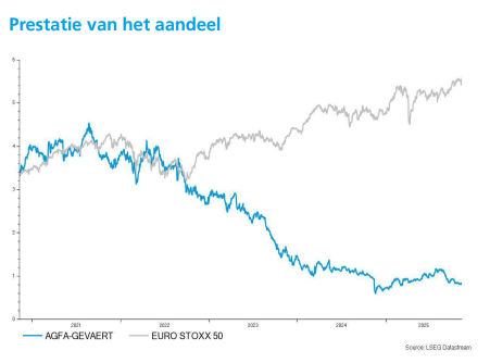 Volgens KBC Securities-analist Guy Sips blijft Agfa onder druk staan door structurele uitdagingen in medische film en economische tegenwind. Toch ziet de analist perspectief op langere termijn dankzij kostenbesparingen en kasinstromen uit desinvesteringen. Het koersdoel zakt van 1,4 naar 1,3 euro en de "Opbouwen"-aanbeveling blijft onveranderd.