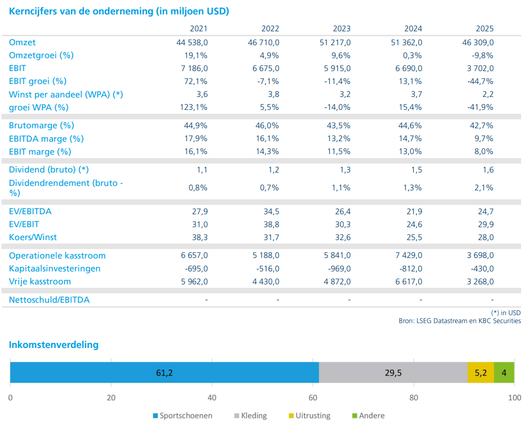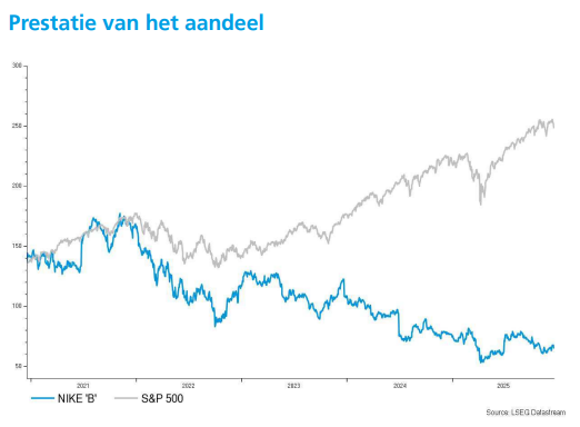 Nike zag de omzet stijgen tot 12,4 miljard dollar (+0,6% jaar-op-jaar), vooral dankzij Noord-Amerika (+8,8%). China daarentegen kende opnieuw een forse daling van 16,8%. De brutomarge zakte naar 40,6%, voornamelijk door extra productkosten van 1,5 miljard dollar door Amerikaanse importtarieven. Digitale verkopen daalden, terwijl externe retailers meer verkochten. De nettowinst daalde met 32%, ondanks een winst per aandeel van 0,53 dollar, wat boven de gemiddelde analistenverwachting (gav) lag.