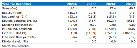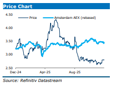 Kristof Samoy verlaagt het koersdoel naar 2,4 euro (van 3,1 euro) en handhaaft een “Houden”-aanbeveling. De analist blijft voorzichtig gezien het gebrek aan zichtbaarheid en geloofwaardigheid rond de groeidoelstellingen.