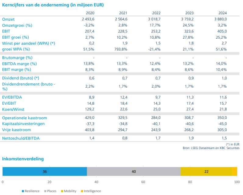 - De omzet steeg organisch (op eigen kracht, zonder rekening te houden met overnames) met 1 procent tot 936 miljoen euro. De operationele EBITA (bedrijfskasstroom) bedroeg 108 miljoen euro, in lijn met de verwachting. De marges stegen met 20 basispunten ondanks beperkte omzetgroei. Niet-operationele kosten van 7 miljoen euro drukten het resultaat, vooral door herstructureringen in het VK en Australië.