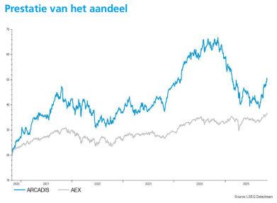 Kristof Samoy waardeert Arcadis als toonaangevend consultant, maar ziet op korte termijn weinig triggers voor een hogere waardering. Het koersdoel wordt vastgesteld op 51 euro met een “Houden”-aanbeveling.
