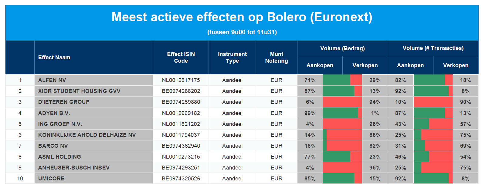 Elke dag bieden we u een overzicht van de meest verhandelde effecten bij Bolero op Euronext. Ideaal om een vinger aan de pols van de beurs te houden en te ontdekken welke aandelen/effecten door medebeleggers druk gekocht of verkocht worden!