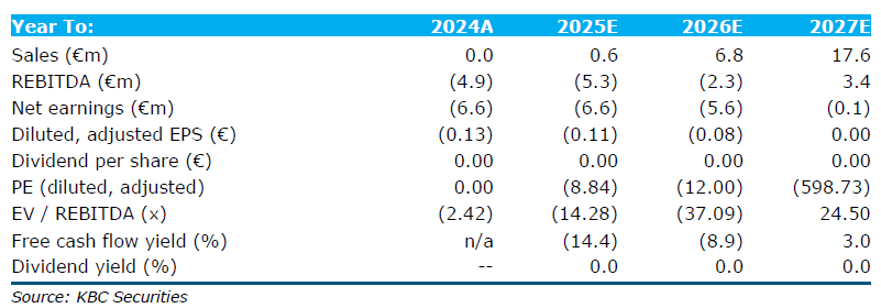 - REBITDA: -4,9 miljoen euro (2024), -5,3 miljoen euro (2025), -2,3 miljoen euro (2026), 3,4 miljoen euro (2027)