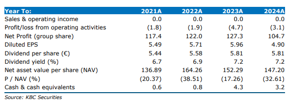Dit resulteert in een blended yield van ongeveer 5% voor 2024 (netto totaal 4,07 euro per aandeel), wat de relatieve aantrekkelijkheid van Solvac vermindert ten opzichte van directe participatie in Solvay.