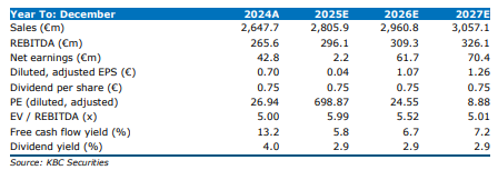 Wim waardeert Tessenderlo voor zijn gezonde vrije kasstroomgeneratie en sterke balans. Hij vindt de waardering aantrekkelijk en blijft positief over het strategisch beleid van het bedrijf. De analist handhaaft zijn opbouwen-aanbeveling en stelt het koersdoel op 28 euro.