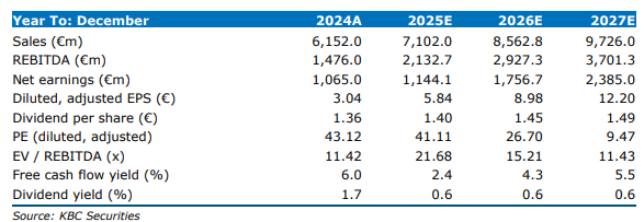 De aangepaste EBITDA-marge wordt geraamd op meer dan 31% (voorheen minstens 30%). Deze verbetering is deels te danken aan de verkoop van gevestigde merken in het kader van UCB’s portfoliovereenvoudiging. Zonder deze eenmalige impact blijft de marge hoger door een verbeterd brutomargeprofiel, meer operationele hefboom en een stijgende winstbijdrage van Evenity.