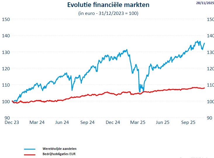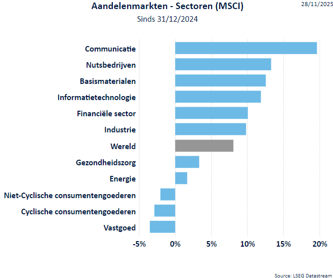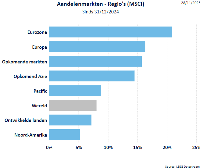 - De MSCI World All Countries index (d.i. inclusief de opkomende landen) ging in november 0,11% naar beneden (+19,46% sinds begin 2025). De MSCI World index stond eind november 0,18% lager (+18,62% sinds het jaarbegin).
