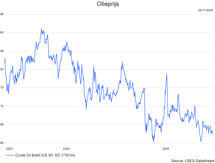 - In november daalde de olieprijs van 64-65 dollar per vat naar 62-63 dollar per vat. De onzekerheid op de wereldmarkt - vooral aanbod, hoger productie door OPEC+ en geopolitieke spanningen - is een belangrijke driver geweest van de daling.