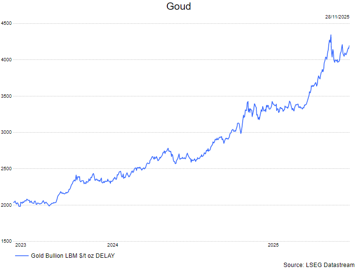 - In november kende de goudprijs een licht opwaartse trend. De stijging eind novmber werd gevoed door een mogelijke rentedaling door de Fed, wat goud aantrekkelijker maakt. Daarnaast spelen de geopolitieke spanningen en de vraag naar goud door de centrale banken, een grote rol.Ook goud-ETF's spelen een rol bij de goudprijs.
