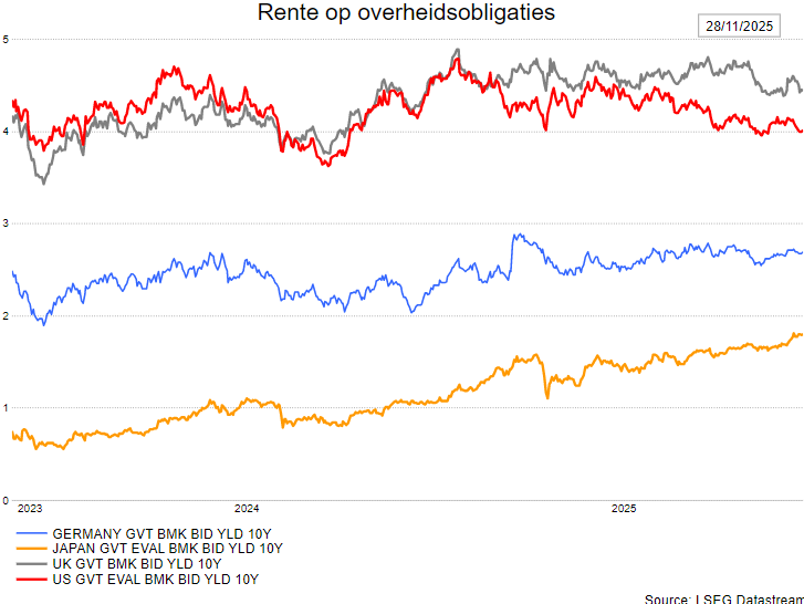 - De obligatierentes gaan lager door toegenomen onzekerheid en lagere beleidsrente; De Amerikaanse rente noteert lager dan 4%.
