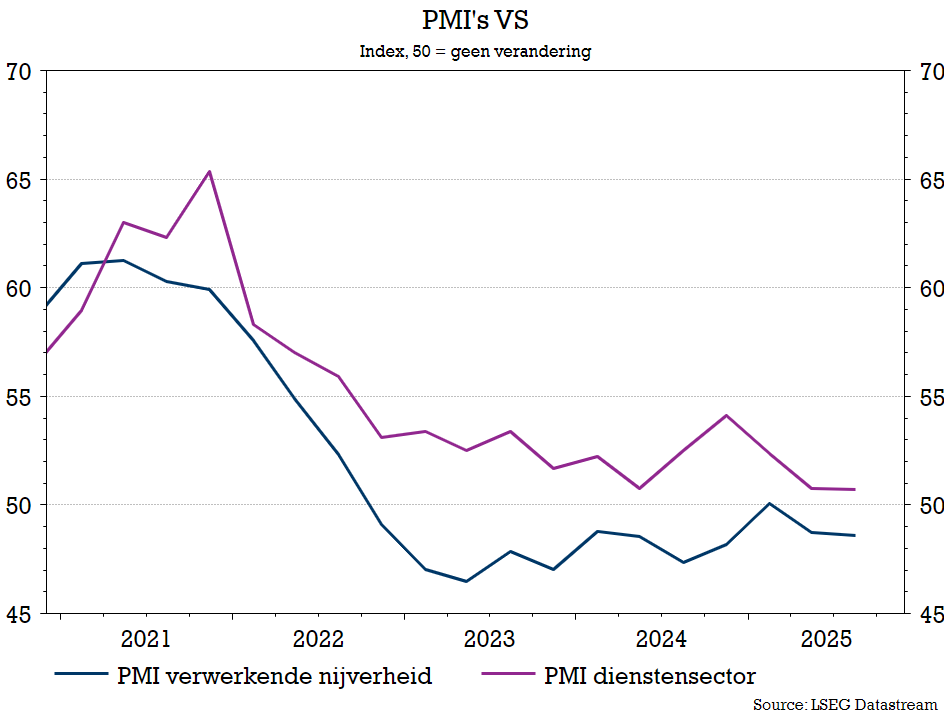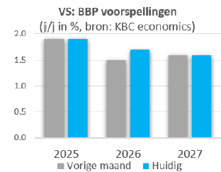 - De goedereninflatie is nog altijd hoog, omdat de invoertarieven geleidelijk in de consumentenprijzen worden doorberekend. De KBC macro-economen verlaagden hun prognose voor de Amerikaanse inflatie in 2025 naar 2,7% maar houden de voorspelling voor 2026 constant op 2,6%.