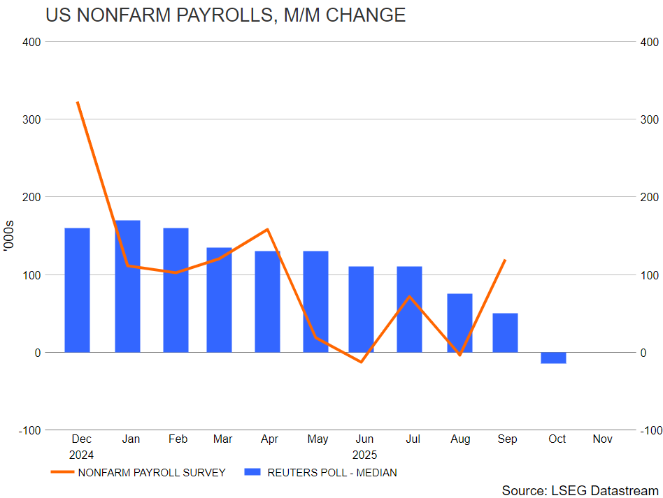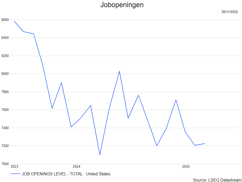 - De wel gepubliceerde cijfers waren over het algemeen positief. Dat geldt ook voor de meeste arbeidsmarktcijfers. Volgens het ADP-rapport kwamen er in oktober 42.000 banen bij. Hoewel dit cijfer ver onder het historische gemiddelde ligt, is het wel hoger dan de negatieve banengroei van de vorige twee maanden. Ook de werkloosheidsaanvragen wijzen op een zekere veerkracht van de arbeidsmarkt. Die cijfers bleven grotendeels ongewijzigd ten opzichte van voorgaande maanden: het aantal eerste aanvragen bleef vrijwel gelijk en het aantal doorlopende aanvragen steeg licht. Dit wijst erop dat het aantal werklozen op korte termijn niet significant zal toenemen.