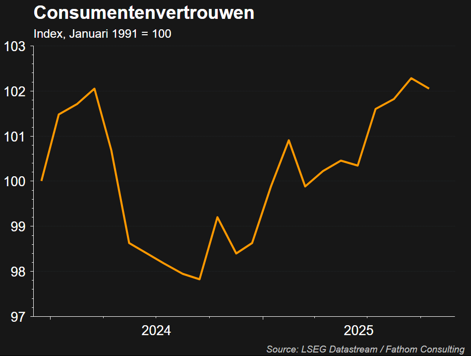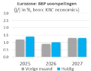 - Ook de indicatoren voor het ondernemers- en consumentenvertrouwen zijn aanzienlijk verbeterd. De KBC Macro-economen verhogen daarom hun groeiprognose voor 2025 van 1,2% naar 1,4% en voor 2026 van 0,9% naar 1,0%.