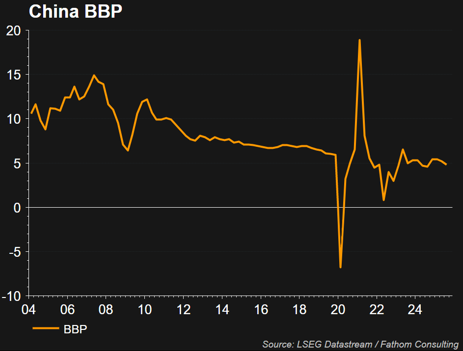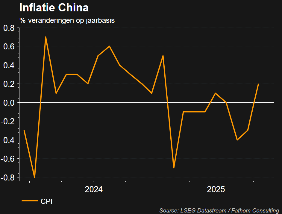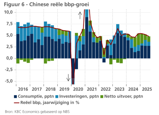 - De bbp-cijfers voor het derde kwartaal bevestigen dat de Chinese economie na een veerkrachtige eerste jaarhelft wat aan elan heeft ingeboet. Het reële bbp groeide met 4,8% op jaarbasis, een daling ten opzichte van de 5,4%- en 5,2%-groei die respectievelijk in het eerste en tweede kwartaal van 2025 werd opgetekend.