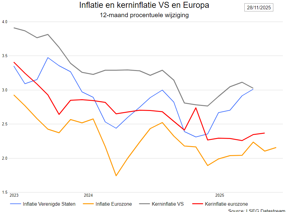- De inflatie in de eurozone daalde in oktober van 2,2% naar 2,1% en schommelt daarmee rond de doelstelling van de ECB. De kleine daling is vooral toe te schrijven aan niet-kerncomponenten, met een afname van zowel de voedingsprijs- als de energie-inflatie.