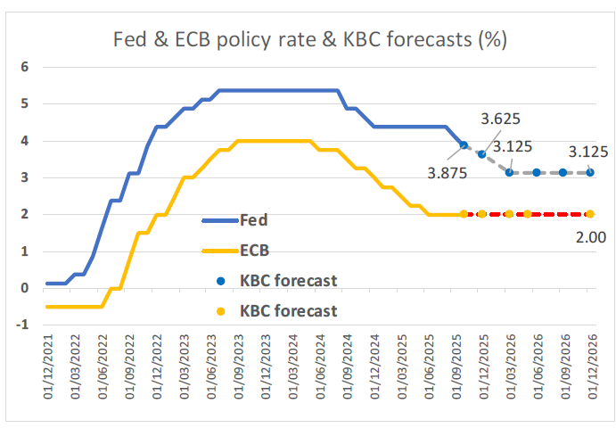 - De Fed daarentegen heeft de beleidsrente in oktober opnieuw verlaagd. Hoewel Fed-voorzitter Powell twijfels heeft geuit over een volgende renteverlaging in december, verwachten de KBC macro-economeb toch dat die zal plaatsvinden. Zij rekenen op nog twee renteverlagingen begin 2026, waardoor de Amerikaanse beleidsrente op een neutraal niveau komt. De risico's van een tragere normalisering van het monetair beleid zijn evenwel aanzienlijk toegenomen.