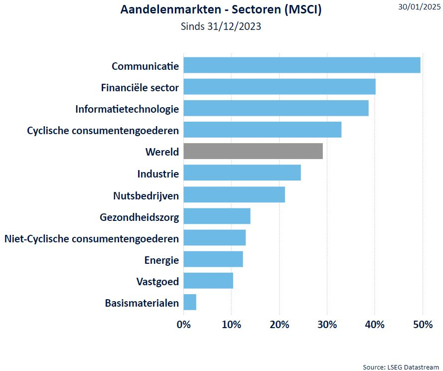 De defensieve sectoren zoals gezondheidszorg en niet-cyclische consumentengoederen blijven achter bij het beursgeweld. De daling van de kortetermijnrente doet de hoop opleven dat ook de langetermijnrente kan dalen. Die is echter afhankelijk van de inflatieverwachtingen. De vastgoedsector profiteerde hiervan in 2024 maar zette een stapje terug begin januari.