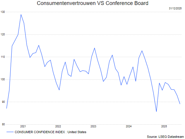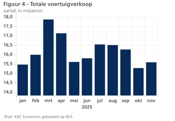 - Aan de negatieve kant bleven de reële persoonlijke consumptieve bestedingen in september stabiel (en werden de cijfers voor augustus naar beneden bijgesteld). In het derde kwartaal groeide de consumptie nog altijd met een behoorlijke 0,7%. In het vierde kwartaal zal de consumptie evenwel afnemen. De indicatoren voor het consumentenvertrouwen blijven op een erg laag niveau. Het aflopen van de belastingvoordelen voor elektrische auto's in september woog ook op de autoverkopen in het vierde kwartaal. Bovendien kan de shutdown in het vierde kwartaal hebben gewogen op de consumptie van federale werknemers die in de betrokken periode met verlof werden gestuurd. In het eerste kwartaal van 2026 zou die dan weer kunnen opveren.