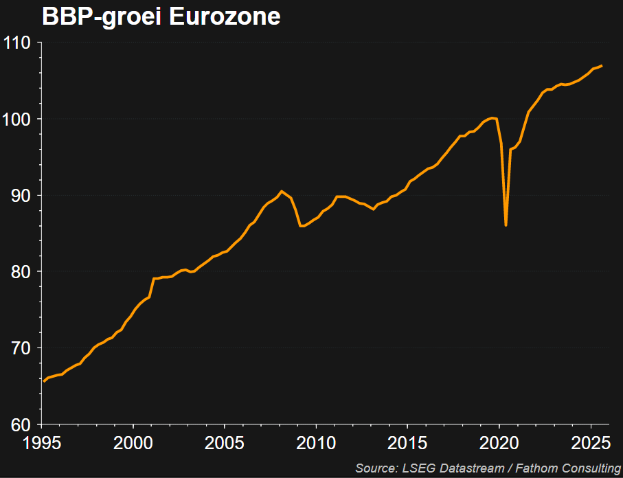 - De ECB liet op 18 december de beleidsrente zoals verwacht onveranderd op 2%, een niveau dat volgens haar de ondergrens vormt van de huidige rentecyclus, terwijl de markt een bijkomende verlaging vrijwel volledig heeft uitgesloten en zelfs een eerste renteverhoging in het najaar van 2026 als risicoscenario beschouwt. De centrale bank gaat ervan uit dat er de komende maanden geen grote externe schokken zullen plaatsvinden, al blijven potentiële risico’s aanwezig, zoals geopolitieke spanningen en onzekerheid rond internationale monetaire verhoudingen. Binnen die context handhaaft de ECB het scenario dat de euro geleidelijk verder zal appreciëren ten opzichte van de dollar, gedreven door de relatieve muntenwaardering en het afnemende renteverschil tussen de ECB en de Fed.