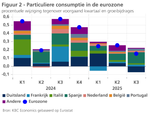 - Het valt op dat de kwartaalgroei van de gezinsbestedingen in de voorbije vijf kwartalen geleidelijk is afgenomen (zie figuur 2). Die groei werd in hoofdzaak door de Spaanse consument overeind gehouden, terwijl vooral de Duitse consument het in het derde kwartaal volledig liet afweten. Over het algemeen hield de consument in de eurozone de vinger op de knip, ondanks de koopkrachtstijging van de lonen en de netto-banencreatie. In het derde kwartaal waren 278.100 meer mensen aan het werk dan een kwartaal eerder, een toename met 0,2%. In vergelijking met een jaar eerder bedroeg de stijging ruim 1 miljoen of 0,6%. Kennelijk hield het lusteloos vertrouwen, dat slechts moeizaam verbetert, de spaarneiging van de gezinnen op een historisch hoog peil.