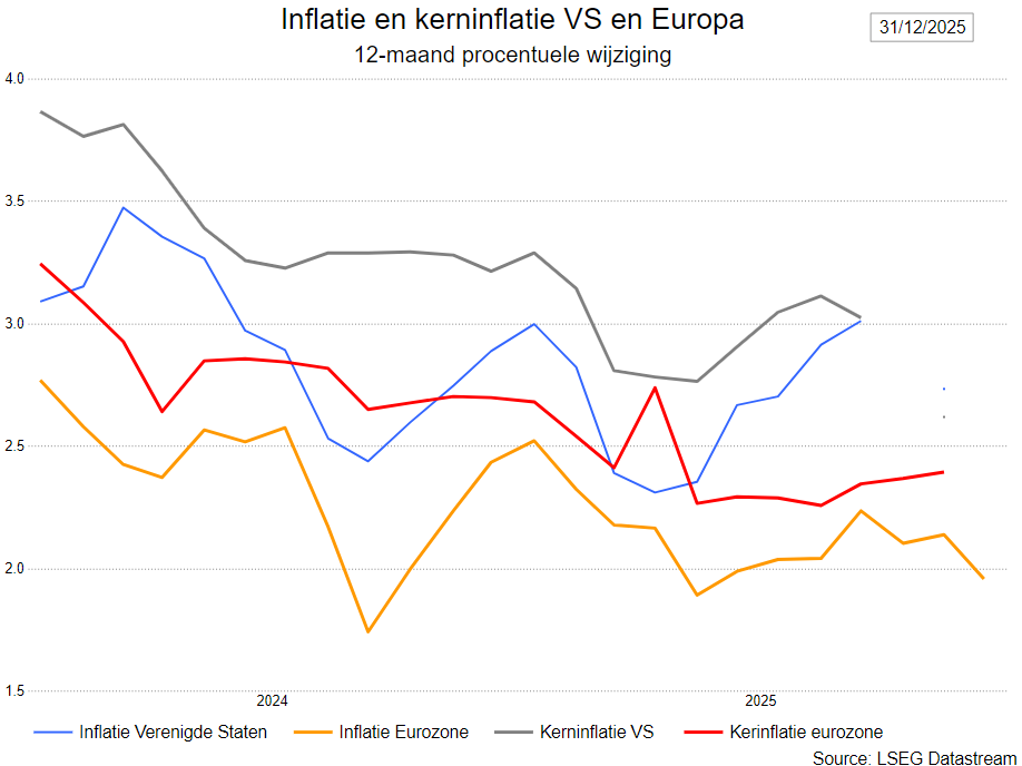 - Het effect van het tariefbeleid van Trump op de inflatie is ook geringer dan verwacht. Hoewel de inflatie in de VS in november nog altijd hoog was, met 2,7%, lijkt zij haar hoogtepunt te hebben bereikt.