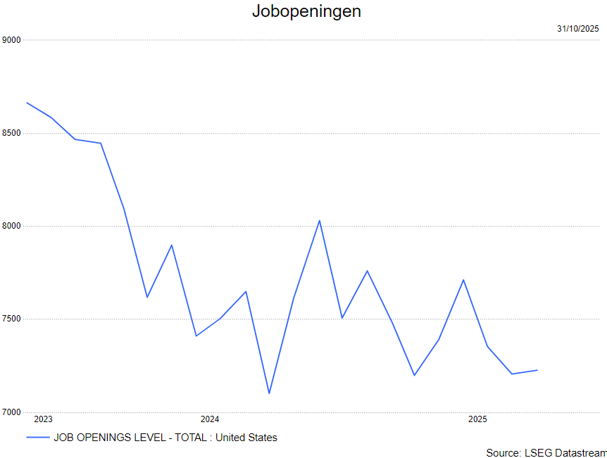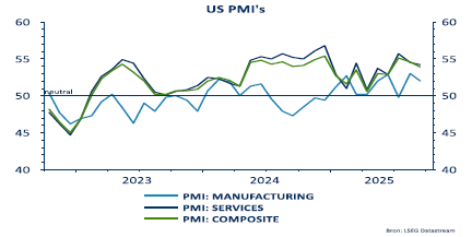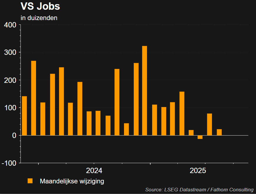 - Toch nemen de uitdagingen toe: de spaarquote is aan de lage kant (de spaarquote daalde van 5,7% naar 4,6%), de regering is in shutdown en de arbeidsmarkt verzwakt gestaag (het ADP-banenrapport toont een jobverlies in de private sector: -32.000 jobs in september). Bovendien werd een groot deel van de investeringsgroei in de eerste jaarhelft veroorzaakt door een AI-gedreven hausse, die de komende kwartalen mogelijk minder zal bijdragen.