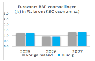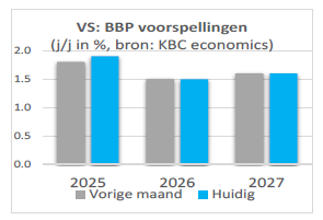 - Per saldo stellen de KBC-macro-economen hun groeiprognose voor de VS voor 2025 bij van 1,8% naar 1,9%, terwijl ze die voor 2026 van 1,5% handhaven