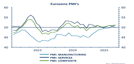 - Het ondernemersvertrouwen stijgt (PMI's> 50; industrie 51,2, diensten 52,9)