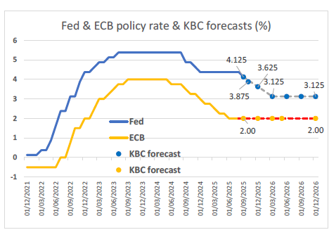 - De Fed hervatte haar renteverlagingscyclus in september, in lijn met haar bezorgdheid over de arbeidsmarkt. De KBC macro-economen verwachten nog vier renteverlagingen, met een beleidsrente die dan finaal uitkomt op 3,125% in maart.