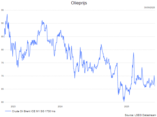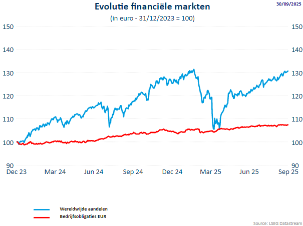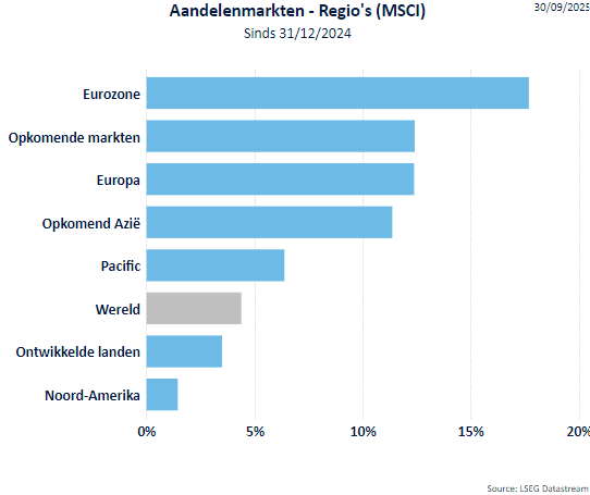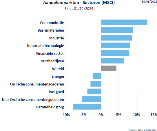 - De MSCI World All Countries index (d.i. inclusief de opkomende landen) ging in september 3,49% hoger (+17,04% sinds begin 2025). De MSCI World index stond eind september 3,08% hoger (+16,15% sinds het jaarbegin). De financiële markten kijken uit naar het beëindigen van diverse geopolitieke conflicten, hebben vrede genomen met de tarieven en kijken uit naar de derdekwartaalresultaten.