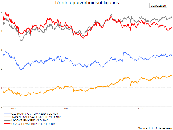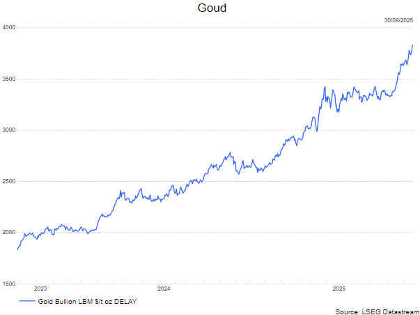 - Ondanks de zwakke economie ging de Euro Stoxx 50 3,33% hoger (+12,44% sedert het begin van 2025). De bredere Stoxx 600 steeg met 1,46%% in september (+9,30% sedert het jaarbegin).