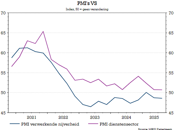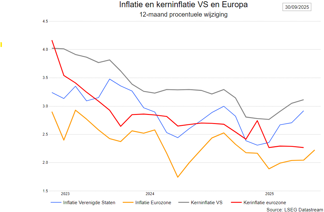 - De inflatie in de VS versnelt. In augustus steeg zij van 2,7% naar 2,9%, doordat de voedings- en energieprijzen sterk toenamen. De kerninflatie bleef onveranderd op een hoge 3,1%. Binnen de kerncomponenten verrasten de prijzen voor huisvesting opwaarts doordat de hotelprijzen zich herstelden en de geïmputeerde huur voor woningeigenaars steeg. De kernprijzen van goederen namen ook toe, dit grotendeels door een forse stijging van de autoprijzen. De aanwijzingen voor door invoertarieven veroorzaakte inflatie blijven vooralsnog gemengd. De producentenprijsinflatie in tussenliggende productiefasen lijkt de laatste maanden te versnellen. De prijsdynamiek voor kerndiensten (excl. huisvesting) vertraagde vorige maand. Gezien de opwaartse verrassing verhogen we onze prognose voor de Amerikaanse inflatie voor 2025 van 2,7% naar 2,8%. Onze prognose voor 2026 handhaven we op 2,6%.