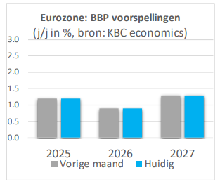 - De macro-economen van KBC handhaven hun groeiprognose voor de eurozone op 1,2% en 0,9% voor respectievelijk 2025 en 2026.
