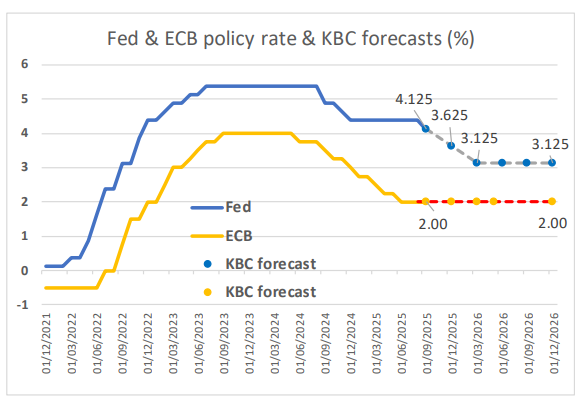 - De KBC macro-economen verwacht een beleidsrente van 3 - 3,25% tegen midden 2026.