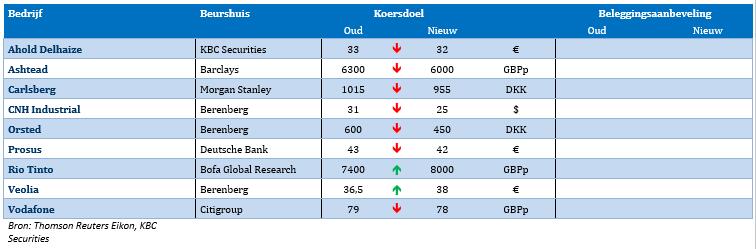 - AholdDelhaize {{19038495, KONINKLIJKE AHOLD DELHAIZE NV, AD}}: de derde kwartaalcijfers stelden recent teleur en dus verlaagde KBC Securities de schattingen voor heel 2023. De onderliggende EBIT-marge zal nog steeds rond 4% schommelen, ondanks de Amerikaanse markt het de komende kwartalen moeilijk zal blijven hebben. Maar daartegenover staan herstellende marges in Europa. Samen met de gezonde balans, aantrekkelijke aandeelhoudersbeloning en sterke staat van dienst, is de korting van meer dan 10% ten opzichte van sectorgenoten in de EU en meer dan 25% ten opzichte van sectorgenoten in de VS niet gerechtvaardigd. Terwijl het “Kopen”-advies behouden blijft, daalt het koersdoel licht van 33 naar 32 euro per aandeel.