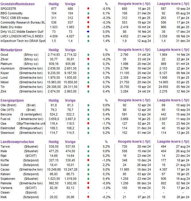 - Op de energiemarkten daalde de olieprijs een weinig (-0,7% naar 80,88 dollar per Brent-vat), waarmee beleggers duidelijk aangeven dat het complexe staakt-het-vuren akkoord tussen Israël en militante groep Hamas niet zomaar eenduidig als een “einde-der-strijd” mag worden gelezen. En dat blijkt terecht, gelet op het uitblijven van dikke witte Israelische rookwolken. De goudprijs volgde die redenering en ging gisteren tegen de trend in tot het hoogste peil in een maand ($2.712,9 per ounce)