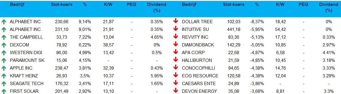 American Eagle Outfitters: {{13595954, AMERICAN EAGLE OUTFITTERS INC., AEO}} de kledingretailer steeg met bijna 24% in de nabeurshandel. American Eagle Outfitters overtrof de verwachtingen in het tweede kwartaal dankzij een samenwerking met actrice Sydney Sweeney, die het bedrijf omschreef als zijn “beste” reclamecampagne tot nu toe. Het bedrijf boekte een winst van 45 dollarcent per aandeel op een omzet van 1,28 miljard dollar. Analisten hadden een winst van 21 dollarcent per aandeel verwacht bij een omzet van 1,24 miljard dollar.