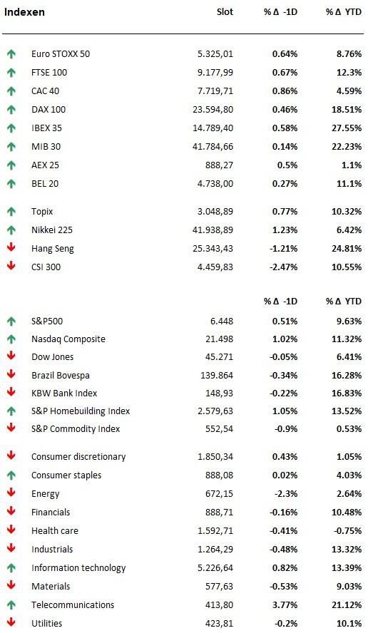 - Soit, we noteren al bij al een dag van rust, dat is al heel wat. De Europese aandelen kregen er gemiddeld 0,67% bij, zodat het Europese beursoverzicht quasi helemaal groen kleurde. Ook Wall Street koos voor de vlucht vooruit, want de S&P500 klokte 0,5% hoger af en de Nasdaq ging onder impuls van een bevrijd Alphabet (+8,5%) vlot 1,1% hoger.