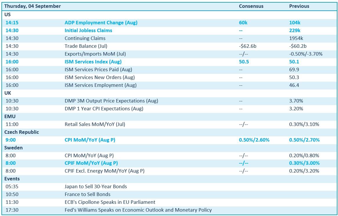 - Het belangrijkste economische nieuws komt vandaag uit de VS, waar de publicatie van het officieuze Amerikaanse banenrapport (ADP-arbeidsmarktrapport) voor augustus op het menu staat. De ISM-index dienstensector en een update van de handelsbalans flankeren dat event, en overschaduwen waarschijnlijk ook de cijfers over de Europese kleinhandelsverkoop over augustus. Voor de verwoede cijferaars onder ons stippen we tot slot ook nog aan dat Tsjechië en Zweden met een update van de inflatiecijfers over augustus op de proppen komen.