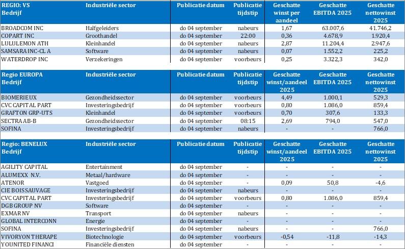 - Bedrijfsresultaten zijn er natuurlijk ook weer. Denk onder meer aan Broadcom, Copart, Lululemon, Samsara, Waterdrop, Biomérieux, CVC Capital, Grafton, Sectra, Sofina, Atenor, Alumexx, Exmar, DGB Group, Younited Finance en Bois Sauvage.